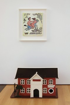 Nick Mauss’ sculptures are materially a mere side-step away from his works on paper, but they not only open up another physical dimension but also enable a conceptual expansion, smartly transforming an elegant drawings show into something less definable. Mauss assumes a detachment from the decisions that occur within his work. A calculated vagueness is at play. In this way his role is as theatrical and self-consciously ‘framed’ as the work’s imagery. Their plucked references call on history to provide a backdrop for an artistic practive, while the white void in which they float conveys the temporal brach of their impossible cross-century straddle.