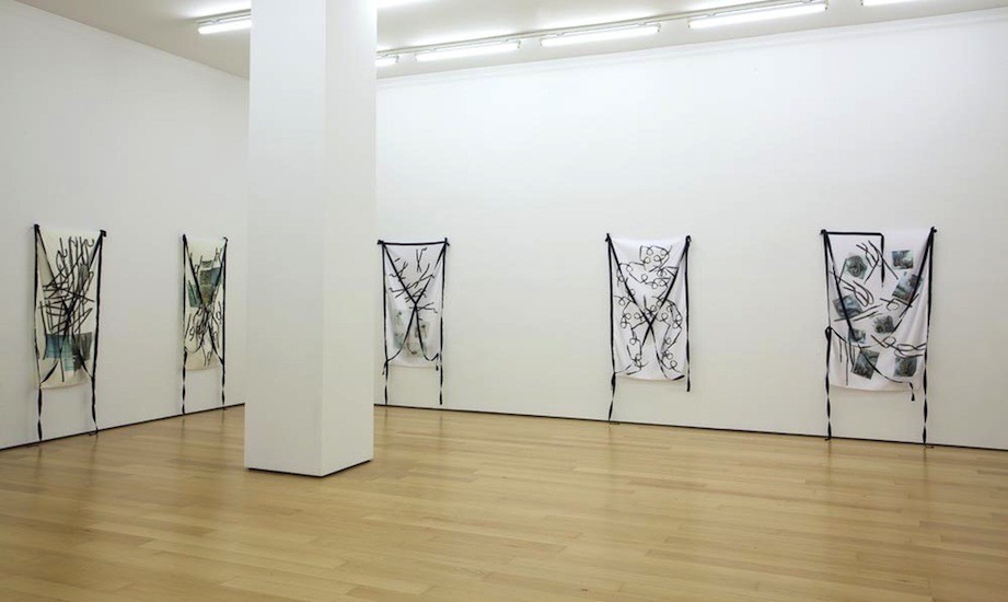 In the current exhibition “ATM”, Sapountzis will present among others, a series of monotypes on fabric. The prints depict sequences of a film that was never shot, leaving behind a personal souvenir album of the artist. The content of these images, is drawn from routes in the city of Berlin; a naked female body outside a supermarket, metals from sculptures in a park, ceramic tiles in a subway station, snack vending machines, cash dispensers out of order...