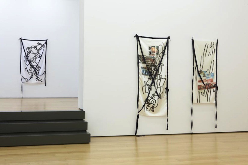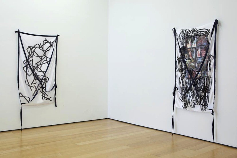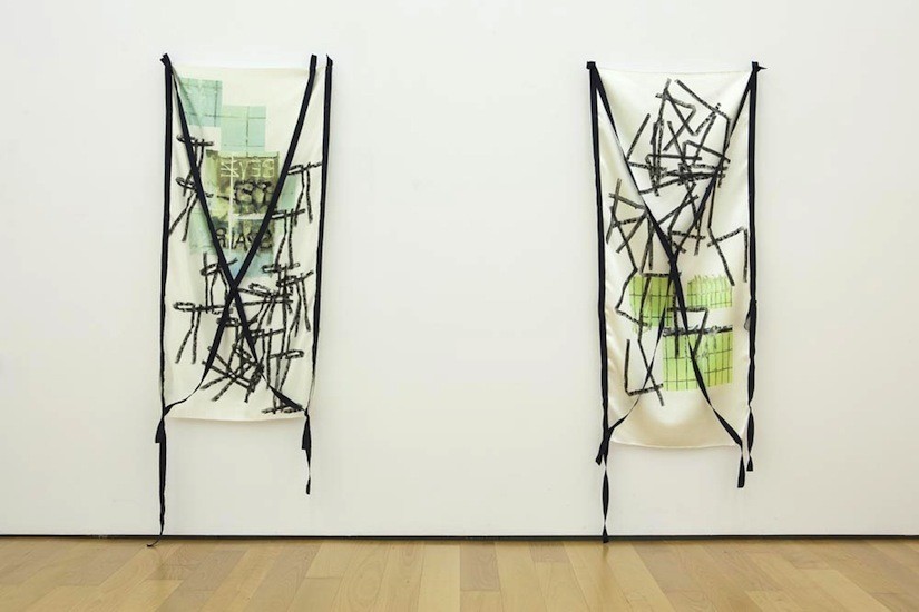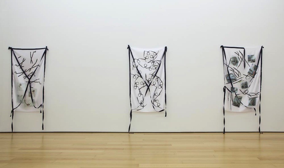 Where is my body after love, 2016, Monotype on fabric, ink, band, pins, 150 x 87 cm