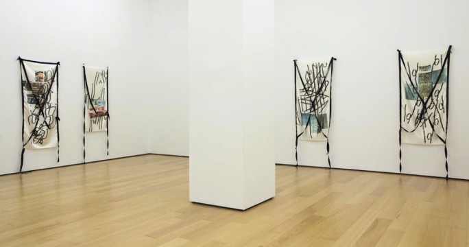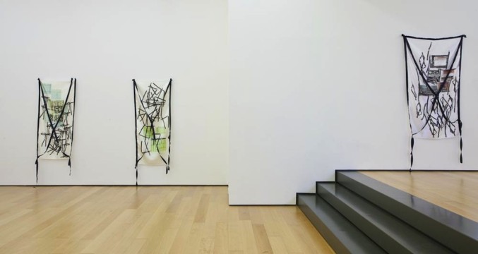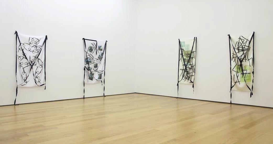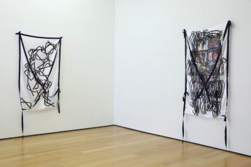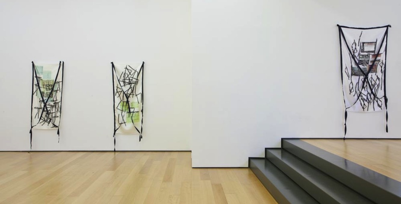 Sapountzis’s multi-media work engages both public and private spaces, taking often as his starting point public monuments and everyday images, objects that represent some aspect of collective and personal memory. At the core of most of his works are sculptural installations that employ such materials as aluminum sheets and rods, brightly colored fabric, pins, knots and straps. All these materials share certain common qualities: they are light, flexible and ductile.