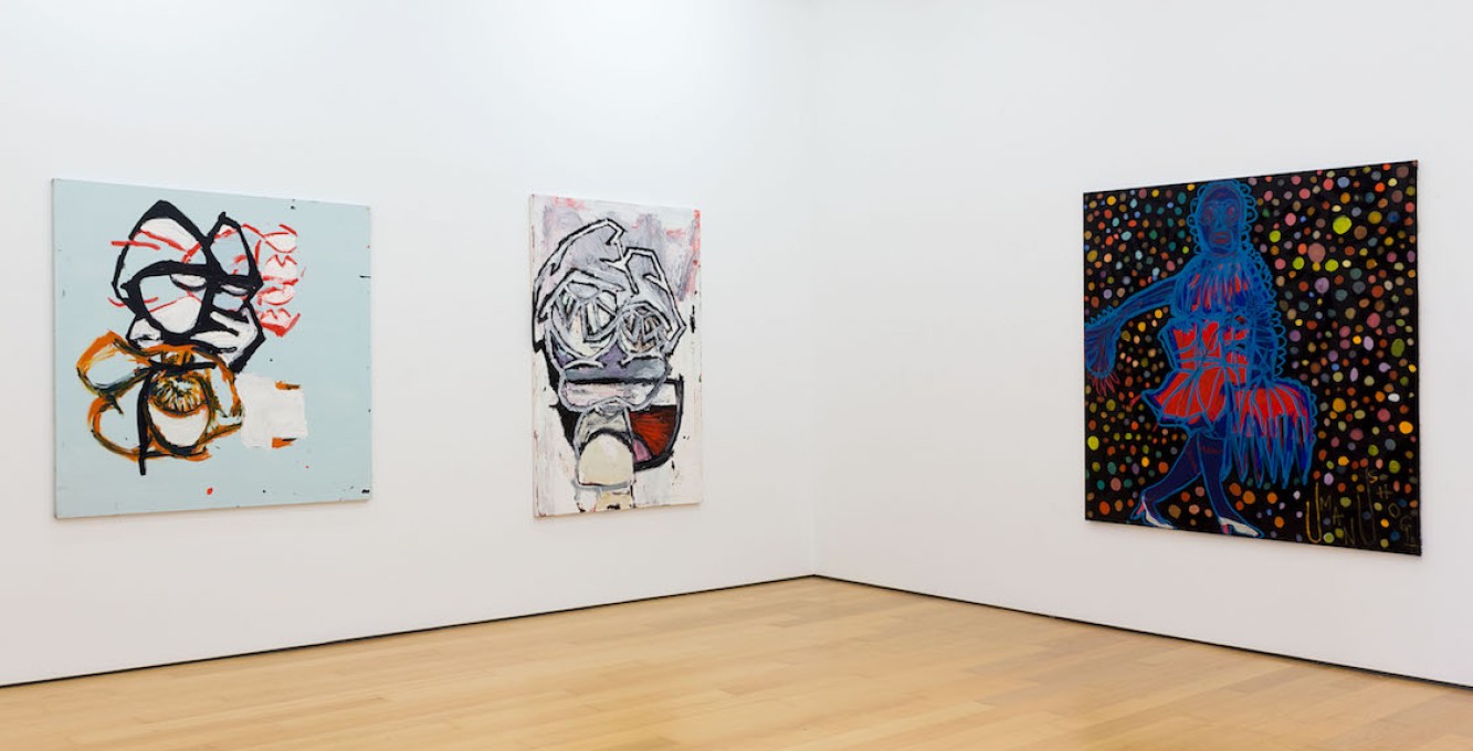 Gerasimos Floratos returns to the gallery after his 2018 exhibition, featuring large-scale paintings and a group of works on paper. His expressive paintings, a psycho-geographic memoir of shared spaces, incorporate various elements derived from his immediate surroundings and encounters of life in the artist’s hometown neighbourhood of Times Square. The artist works with heavily applied colour using bold mark making by oil stick and his own hands, combined with found collage elements to depict autobiographical characters and animal-like creatures that occupy his canvases.