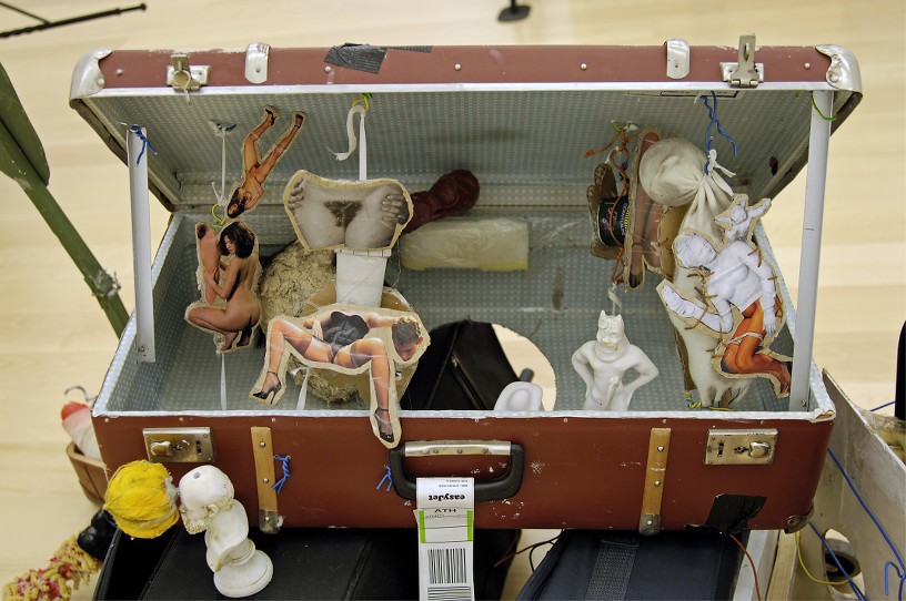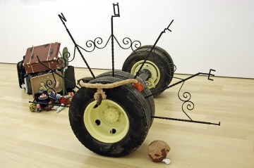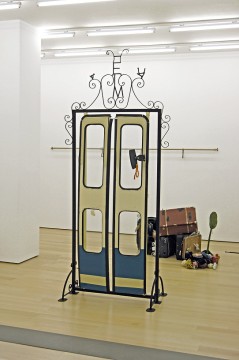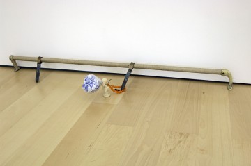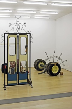 John Bock uses the form of performance as artistic medium, combining theater, video, installation and sculpture. Most of his early actions or performances were termed “lectures” and originated in the idea of an academic lesson on economic concerns. Starting out from that basis he has developed over time increasingly complex, large-scale installations in which he employs simple everyday objects and materials, like wood, fabric, wire, cotton wadding, toothpaste, shaving cream, cleaning products, and food, which he treats and combines in unusual ways in order to create simple structures of life as well as art’s evolution into abstract forms and paranoid models.