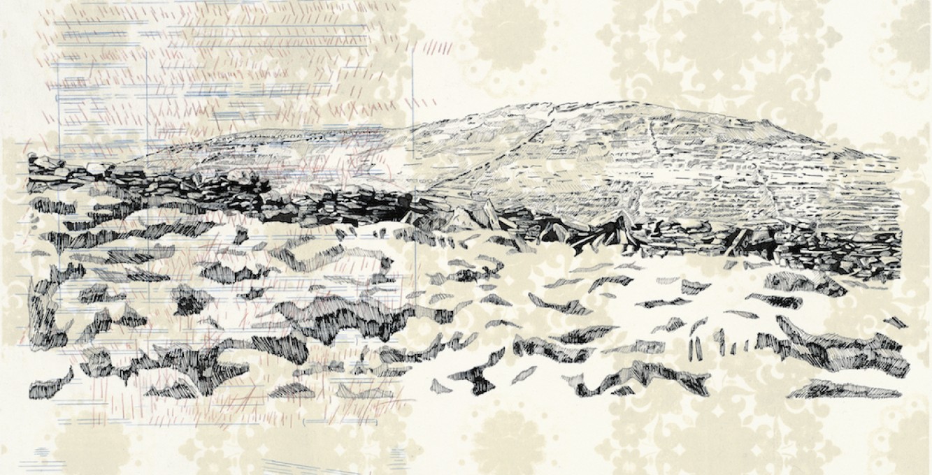 Domestic stratigraphy is a series of rapidograph drawings from Eirene Efstathiou’s photographs of terracing on Cycladic mountainsides overlayed on lithographs from Formica tabletop patterns (popular in Greece in the 70s and 80s). The works are a meditation on labor and making, and the traces of minor yet vital history on the landscape. The juxtaposition of these two very different patterns proposes land as a domestic space and the memory of labor on the land as monumental. Eirene Efstathiou’s (1980, Athens, Greece) studio practice begins with compiling archival source material, as well as material drawn from deliberate wanderings, as a way to re-narrate minor histories and comment on the collective memory.