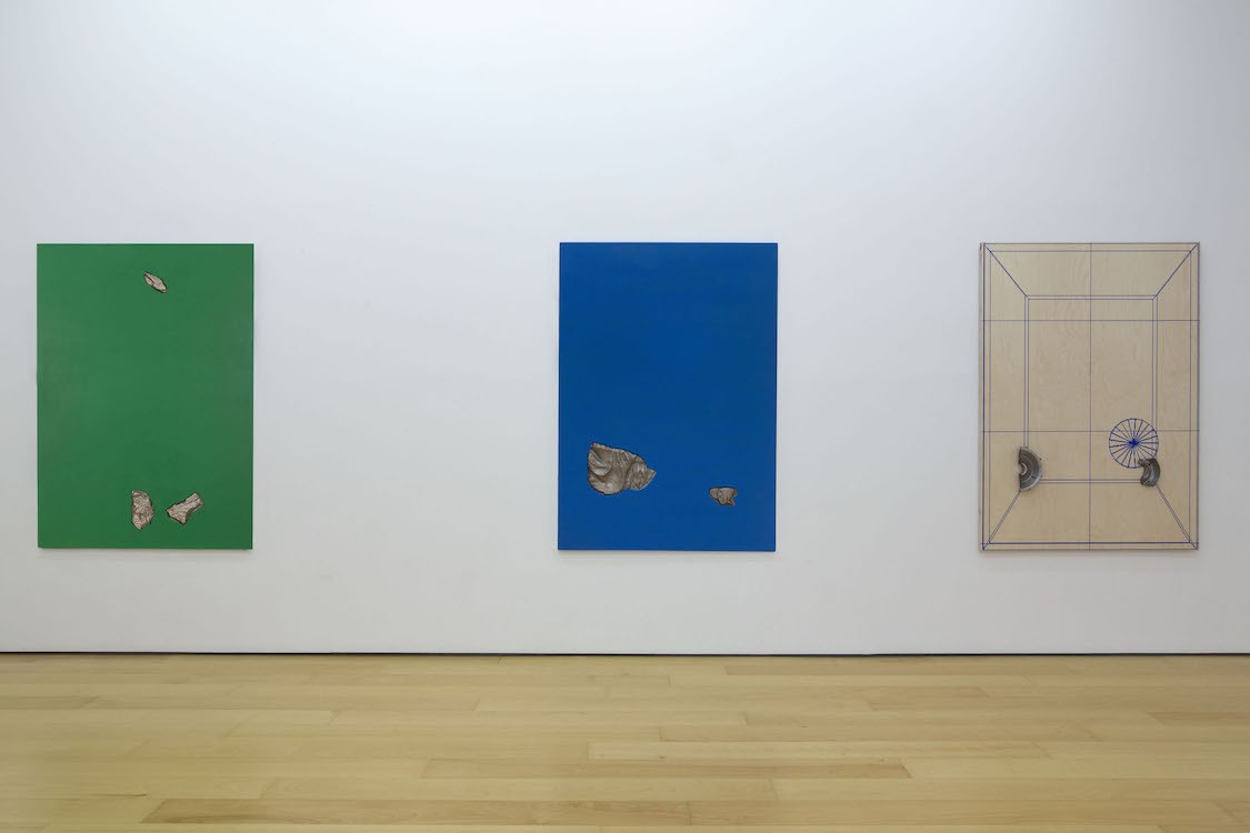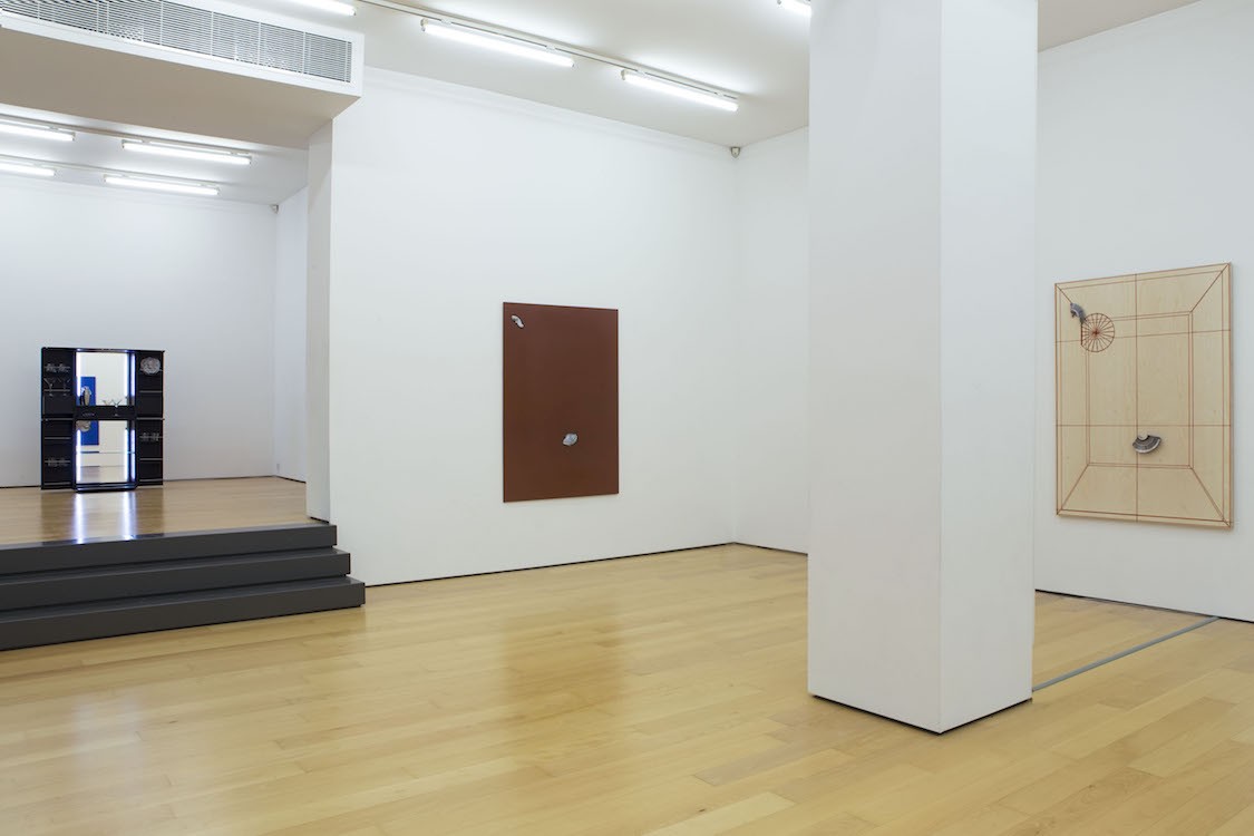 The main body of works presented in the show consists of a series of six monochrome paintings in two parts, where the past is cited to modern life. In the three paintings of the first part, the use of one acrylic colour over the entire plywood is intervened by embedded casted aluminium reliefs. The artist uses techniques and practises like, 3D reconstruction, 3D fabrication and default machine learning algorithms to define his final colour palette. Giannakis renarrates, reconstructs and modifies forms and stories, myths that have shaped the collective human race for millennia inside a flow space and time. In the second part, the other three paintings act as a twisted mirror. Acrylics on plywood and metallic fragments of used mechanical parts, give the impression of a window, a room, an area of interest, which the objects are going to be rendered. Here the artist paints his computer screen viewport on the plywood so that inclined lines appear inappropriately jagged.