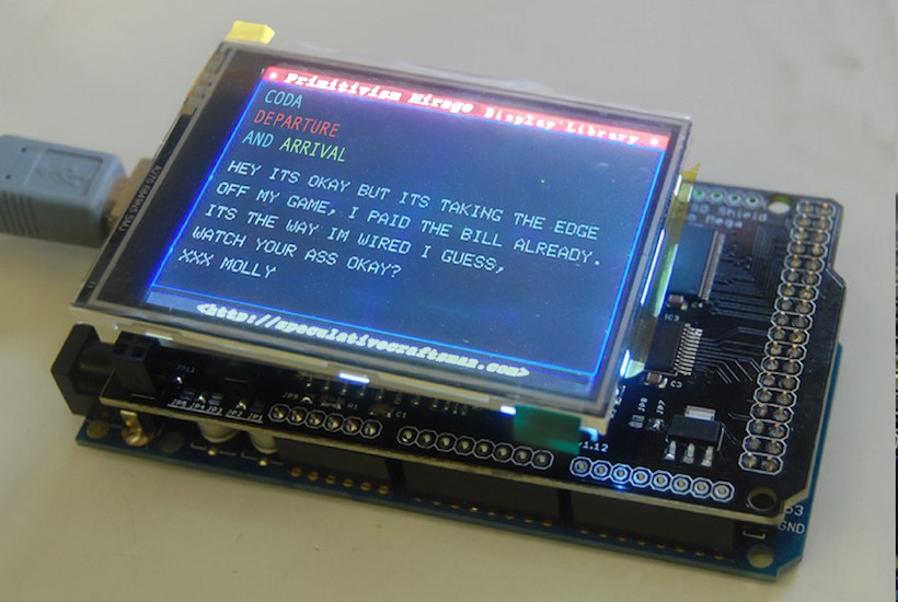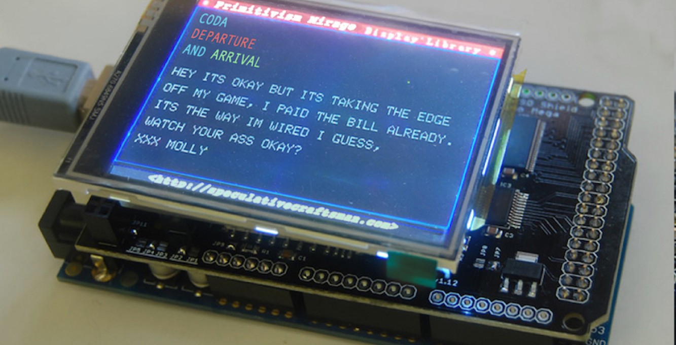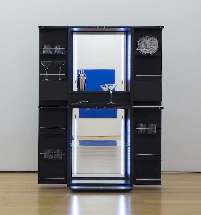 A final work, perhaps the most complex on view, belongs to neither series but rather suggests an enclosure summation by combining elements of all. A server, a cabinet bar, is a composition of a farewell electronic note on a shield screen (an electronic encapsulation of the Neuromancer novel in a microcontroller), a heritage cocktail, fuel to hijack consciousness and lastly an aluminium apotropaic mask of the Gorgoneion, a protective symbol.