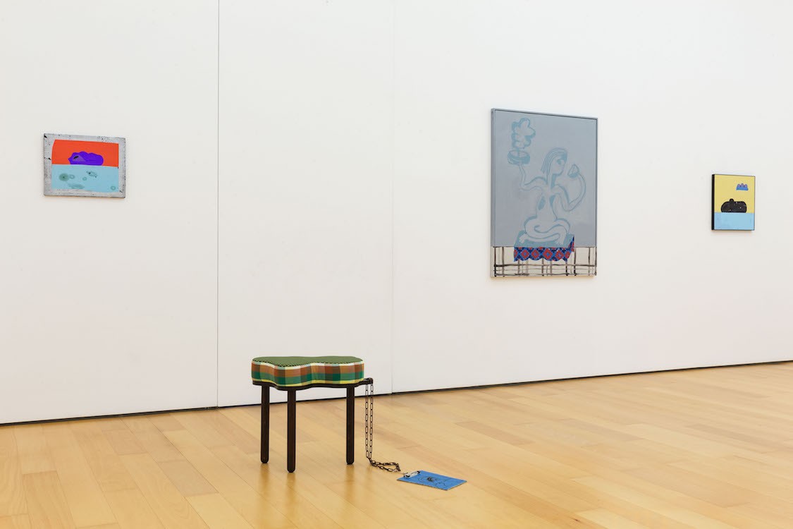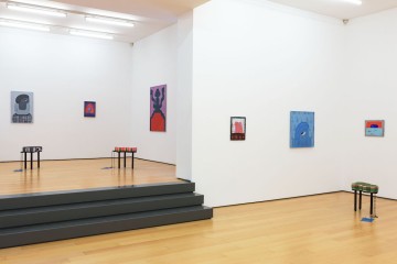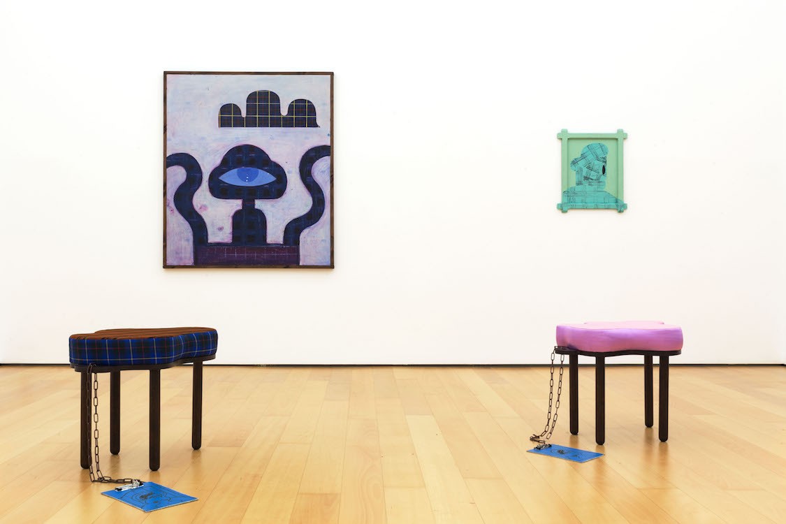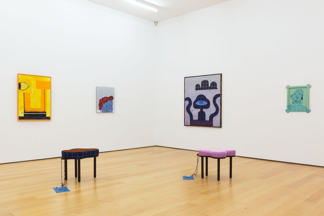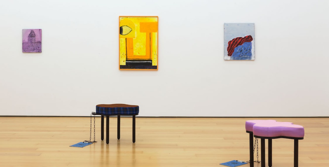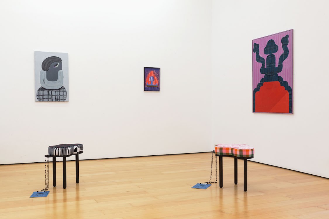 Along with the paintings and the collages, six seating objects fill the gallery space. Those stools are custom-made and completely functional for the viewer to sit on them. In addition, a chain connects each one of these stools to a clipboard with a unique drawing, made with the use of a pyrography machine. The viewer is invited to tear off a piece of paper and make a rubbing of the burned out drawing.
