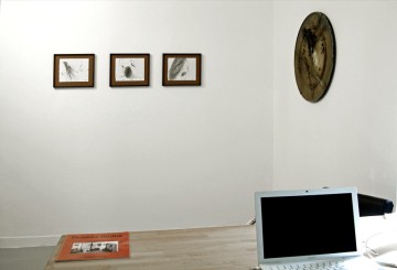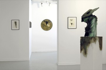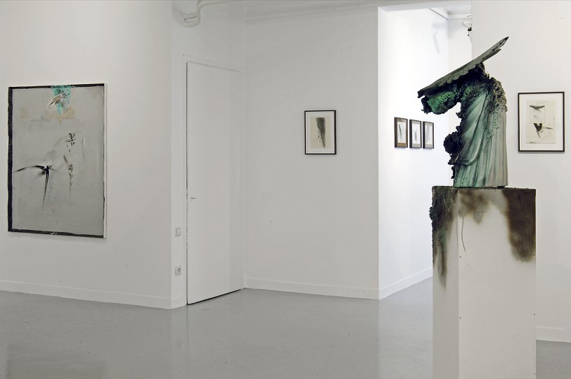 The paintings and drawings of Thomas Helbig, suggestive of landscapes or portraits, become longing abstractions. The figurative is dissolved into organic mysterious abstract images. Thrown away pieces of metal or wood become his canvases. In the current exhibition the paintings and drawings show hovering and flying forms that come from above, in order to demonstrate an allusion to the cosmos and the universe. These forms appear to be weightless and they recall airplanes, UFOs or stars accumulations, which are for Helbig an expression of Baroque illusionism. The works give a hint impression of something familiar, however they remain enigmatic and ambiguous.