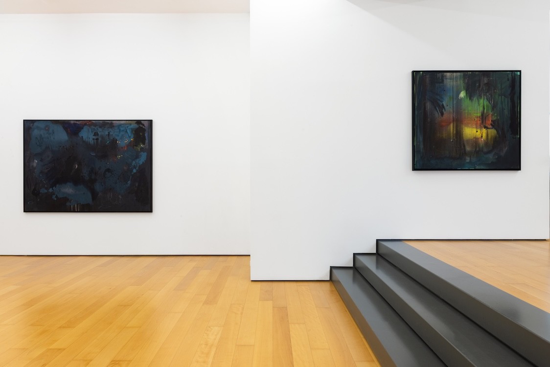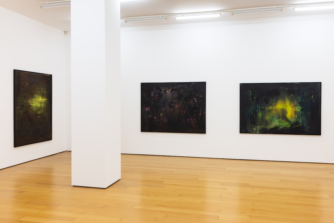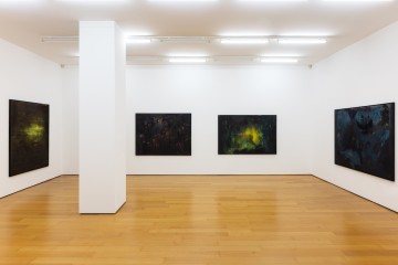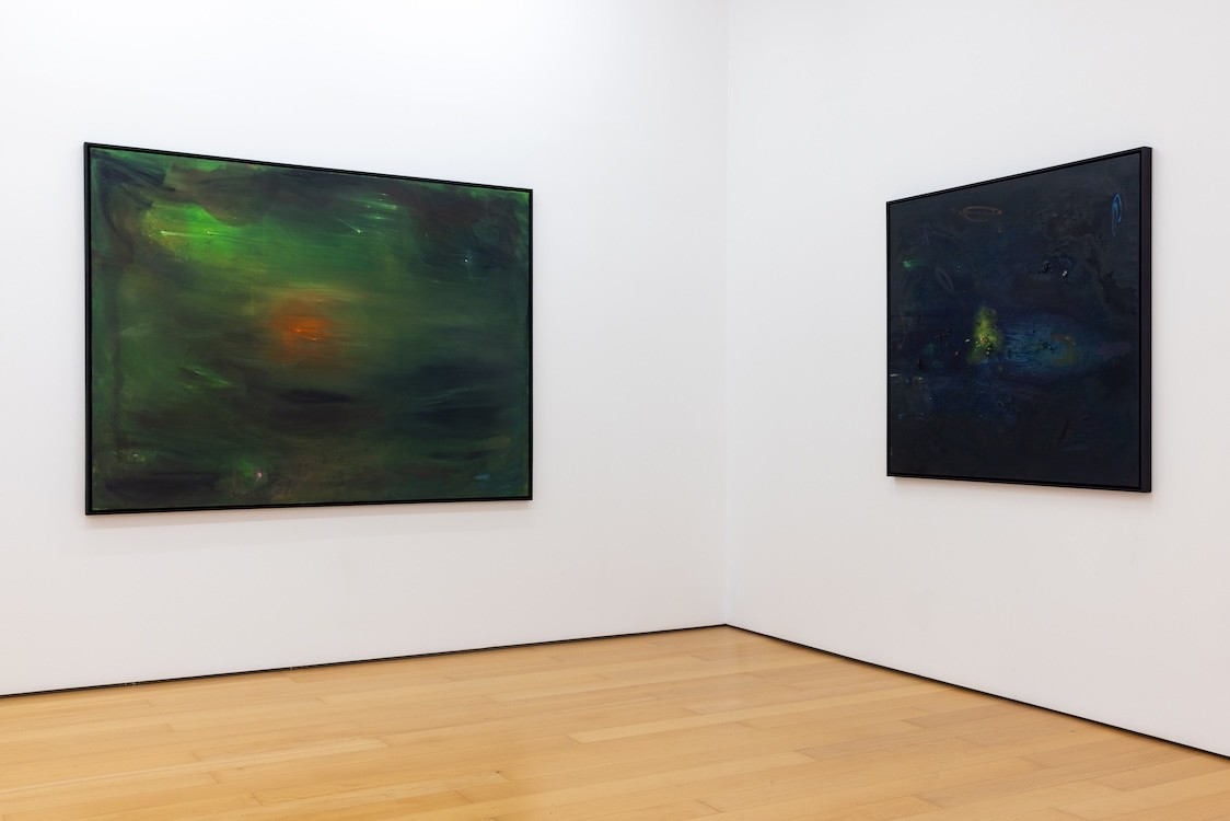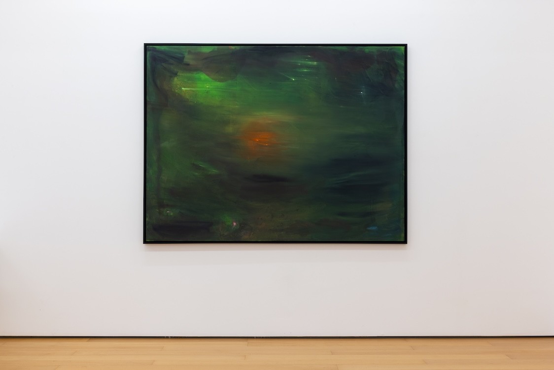 Calling the works in this exhibition “landscapes” is both helpful and misleading. The seven paintings do feature forms that can be found in nature, like clouds, trees, or rays of light, and they evoke natural phenomena, such as twilight, fog, or volcanic eruptions. Yet the term is not entirely accurate, in that the paintings do not have a clear spatial orientation that defines them as a panorama or a specific place that could be visited. Instead, they create their own space in which color and light are the main actors.