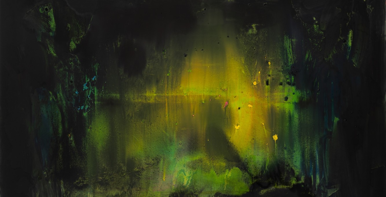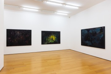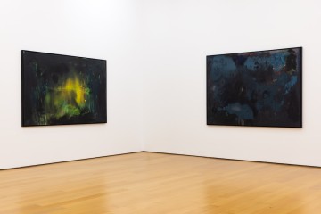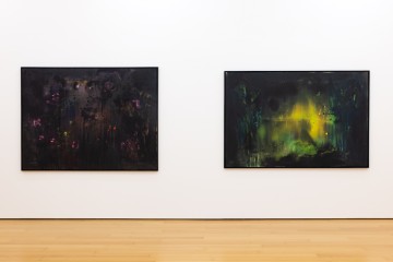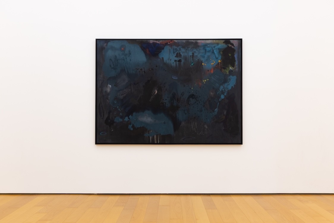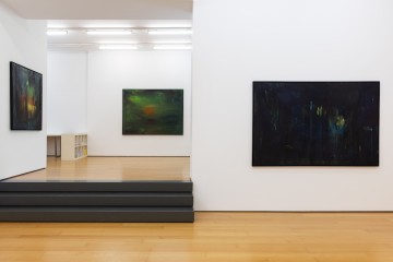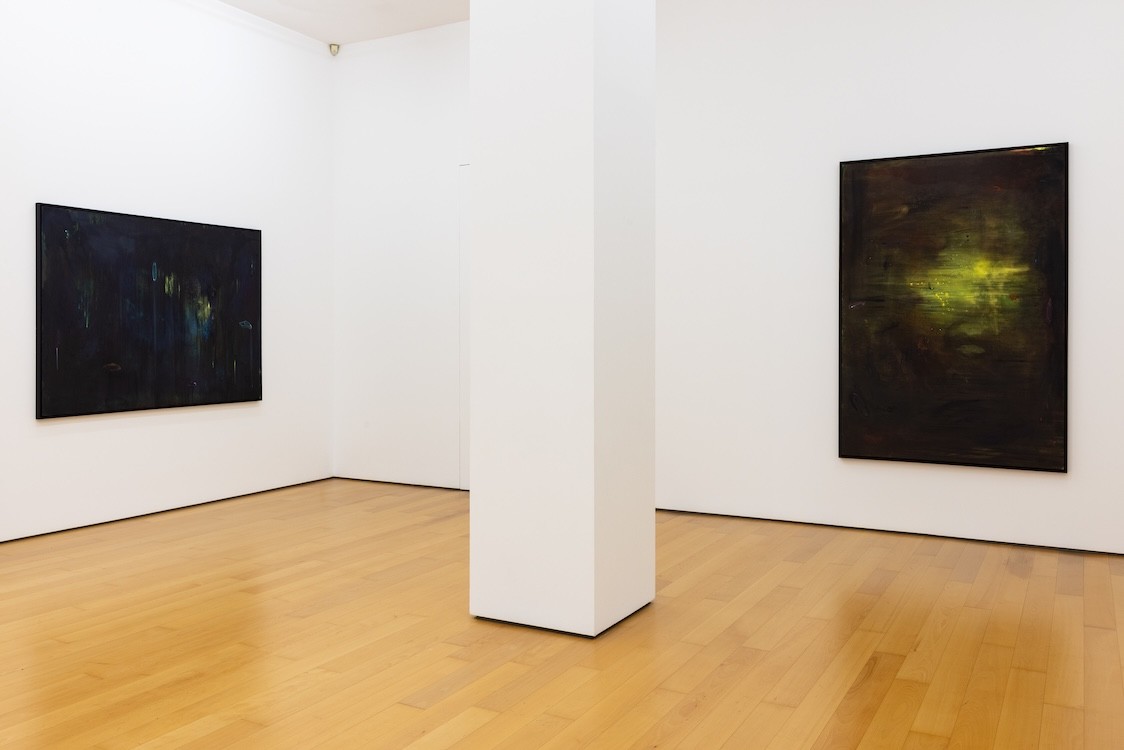 Calling the works in this exhibition “landscapes” is both helpful and misleading. The seven paintings do feature forms that can be found in nature, like clouds, trees, or rays of light, and they evoke natural phenomena, such as twilight, fog, or volcanic eruptions. Yet the term is not entirely accurate, in that the paintings do not have a clear spatial orientation that defines them as a panorama or a specific place that could be visited. Instead, they create their own space in which color and light are the main actors.