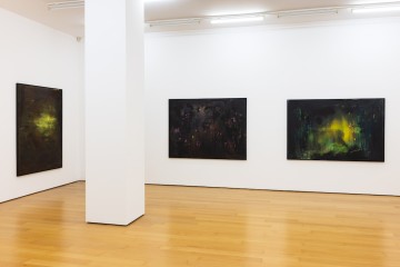 Even though the paintings together appear as a rather dark ensemble, each of the paintings started with light, with the application of a vibrant and “loud” layer of color, be it yellow, red, or green. Over time, darker layers – blues and violets, but never pure black – were built up on top, partially covering or muting the colors beneath. Thus a play of light and dark appears, just as alternations between carefully crafted and loose or blurry areas are established. Through such differences, the impression of air or fluidity is evoked. Light plays a crucial role in the paintings, and provides, like in a theater, a tool to direct the attention or define where “the action” is taking place. It leads the eye through different areas, ranging from refined sections, to more loose or harsh passages of paint. The artist is the director of light, adjusting and fine-tuning the temperature of the paintings.