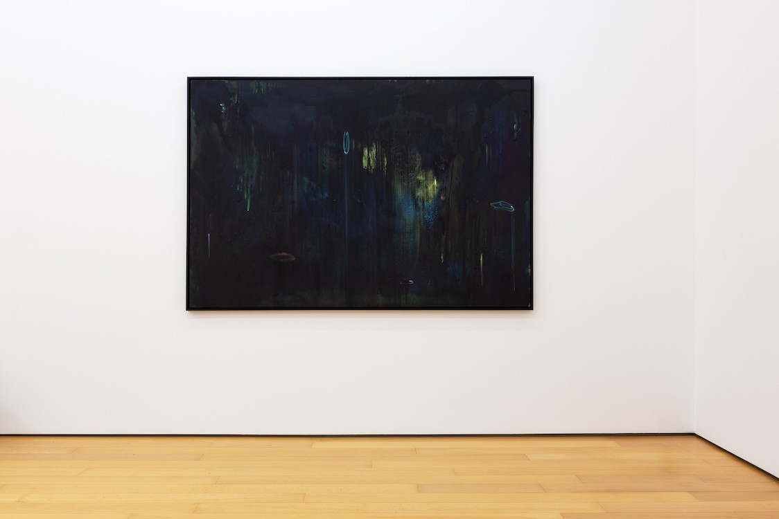 The titles of the individual works – like Volcano Love, Murky Sunset, and The Cave – offer possibilities, ways of seeing, rather than exact descriptions or explanations. As shown through the abstraction of the works, the artist is aware that every description leaves something unsaid, and avoids precision. He has an ambivalent relationship with language. In the previous decade, he made a series of so-called text paintings that include words and phrases drawn from daily life. The language is applied on the canvas in such a dense way that it stops making sense as a text – it is about the visual impact. In his current series, language has largely fallen silent. There are some scribbles and signs that resemble letters, symbols, or tags, but far more important is the grammar of mark-making, of dots, scrolls, and other types of punctuation that are articulated through color.