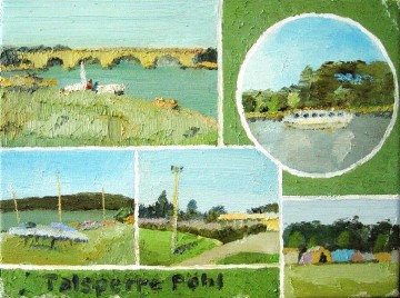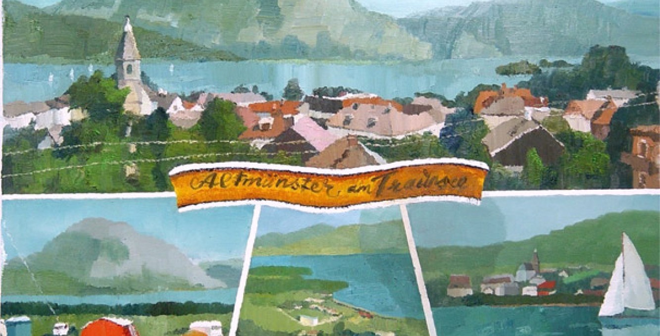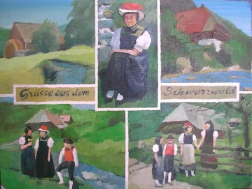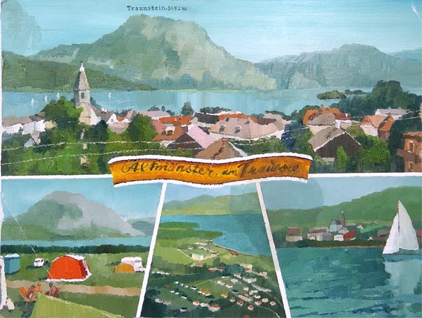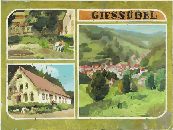 In the current exhibition with the title “Liebe Gruesse” Yuzheng will present paintings in big and smaller size. He collects images from the flee- market, like old postcards from the 60s and 70s with images from mountain landscapes in Germany (black forest), etiquettes from consuming products etc., and transforms them into painting, trying always to bring the gleams of time into his pictures.